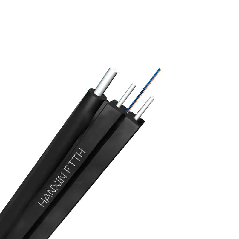 FTTH室内光缆是将光通信单元处于中心,两侧放置两根平行非金属加强元件(FRP),在外侧再附加一根钢丝加强元件,最后,挤制黑色或彩色低烟无卤护套成缆。